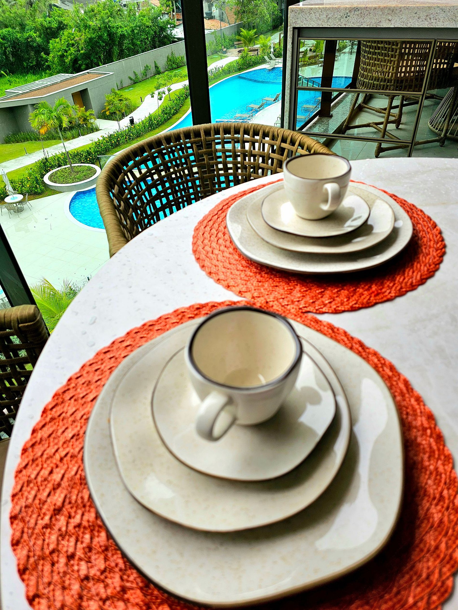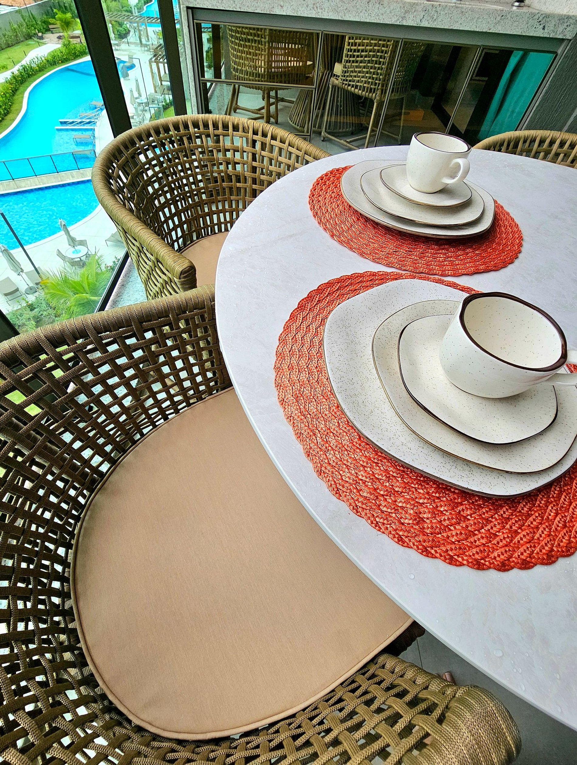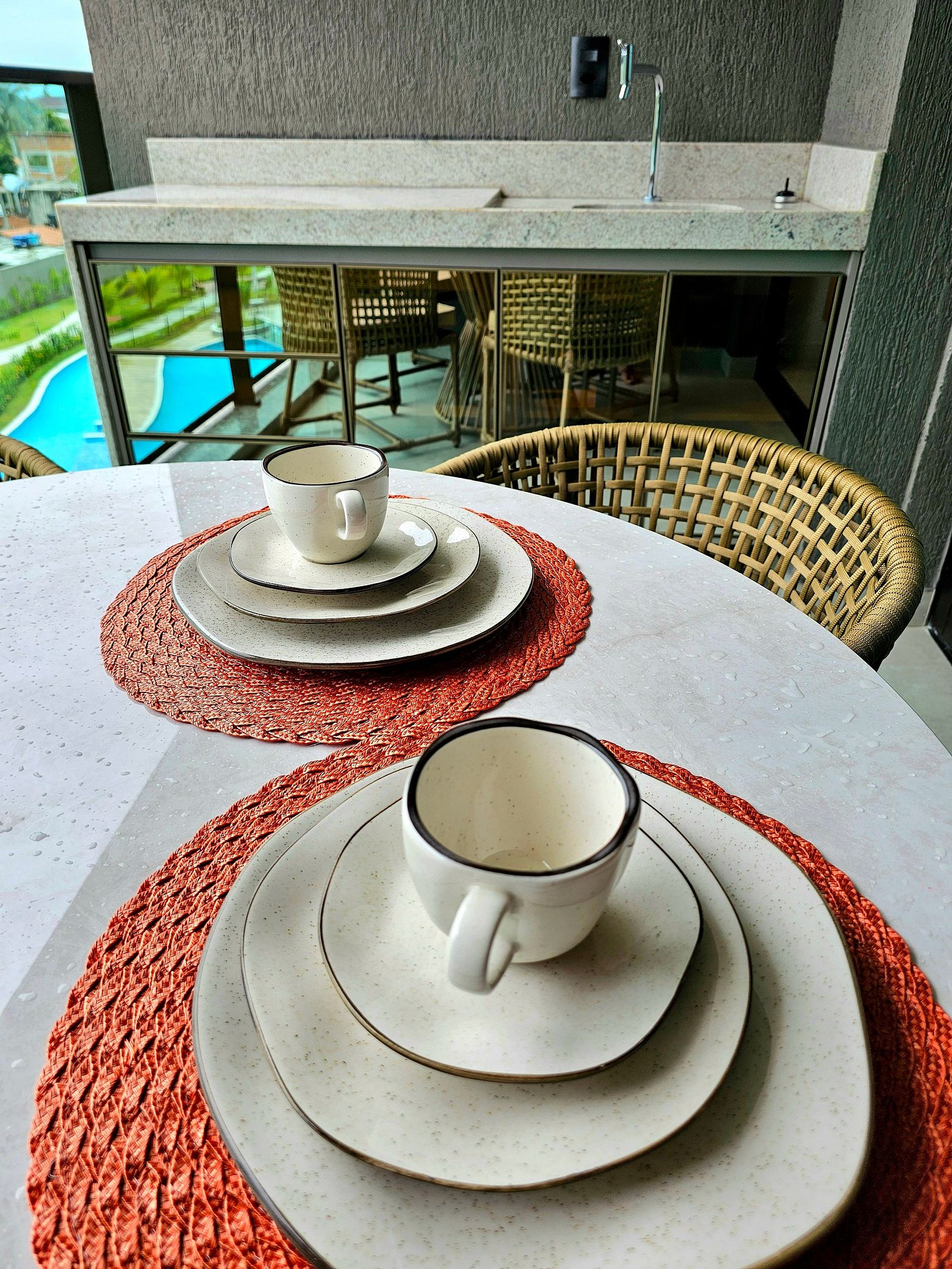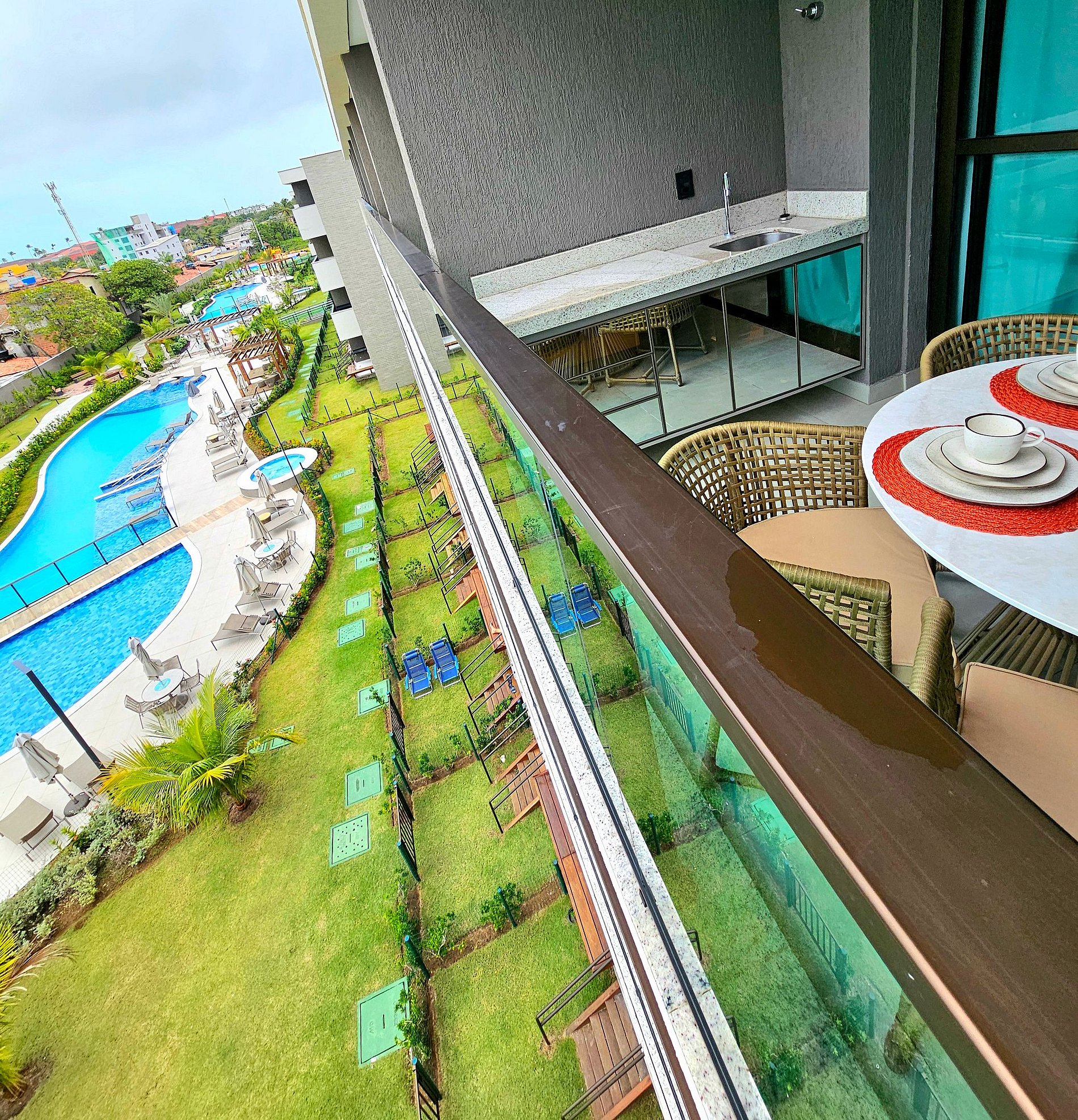 A Cereja do Bolo é nossa varanda gourmet com uma ótima mesa, confortável e moderna para refeições e vista para o complexo aquático do empreendimento.