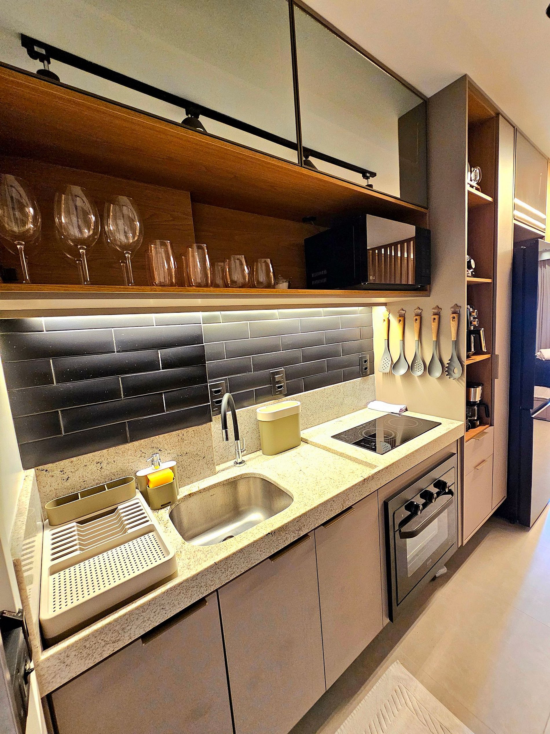A cozinha completa é equipada com os principais eletrodomésticos, como geladeira duplex, microondas, cooktop, cafeteira, liquidificador, sanduicheira e airfryer, além de todos os utensílios necessários para que você possa preparar suas refeições de maneira prática e confortável.