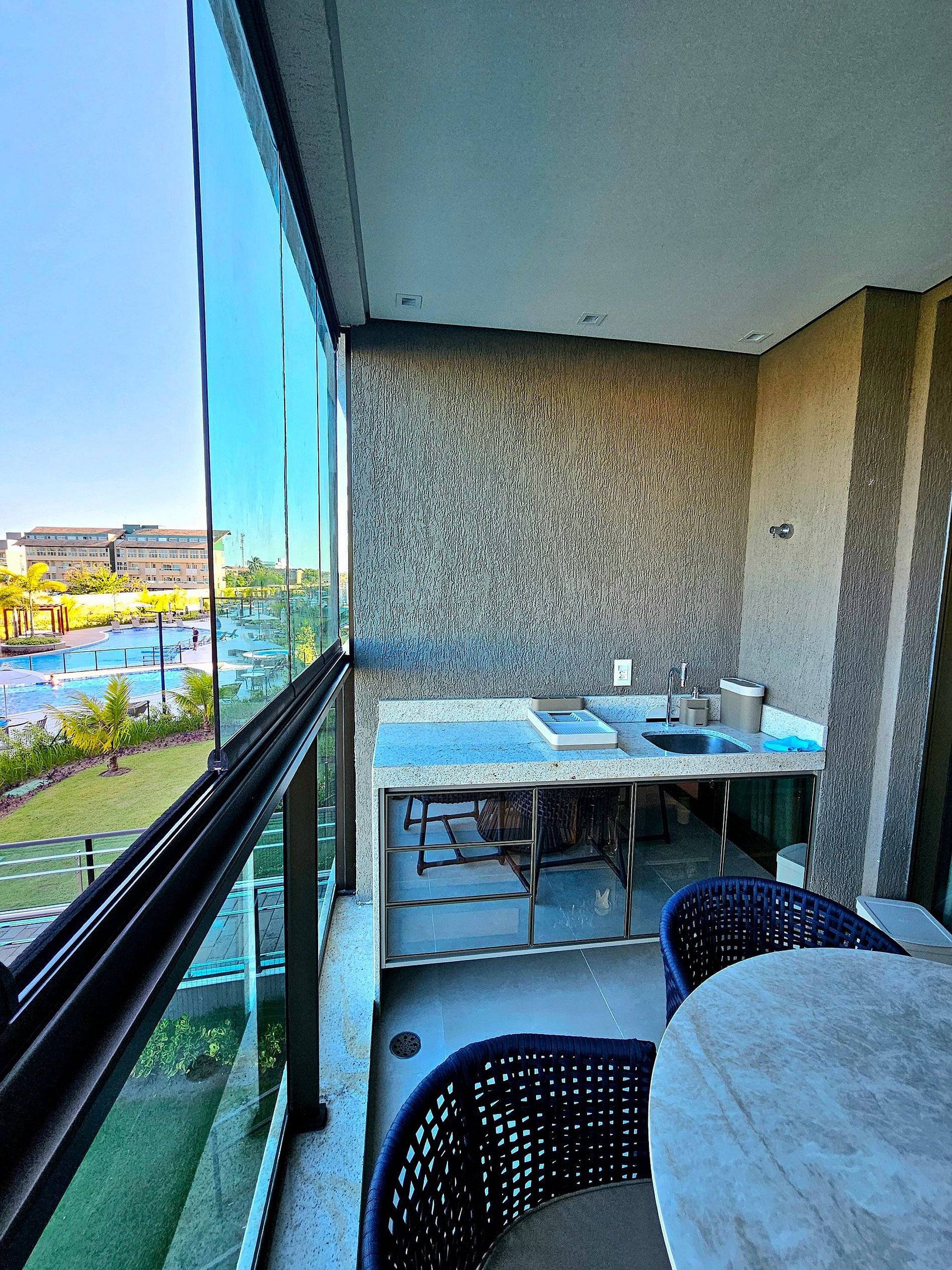 A Cereja do Bolo é nossa varanda gourmet com uma ótima mesa, confortável e moderna para refeições e vista para o complexo aquático do empreendimento.