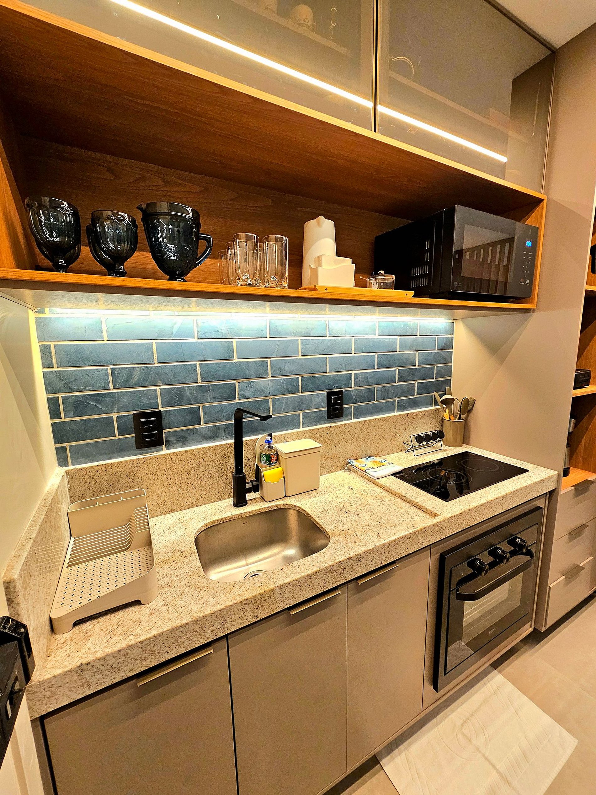A cozinha completa é equipada com os principais eletrodomésticos, como geladeira duplex, microondas, cooktop, cafeteira, liquidificador, sanduicheira e airfryer, além de todos os utensílios necessários para que você possa preparar suas refeições de maneira prática e confortável.