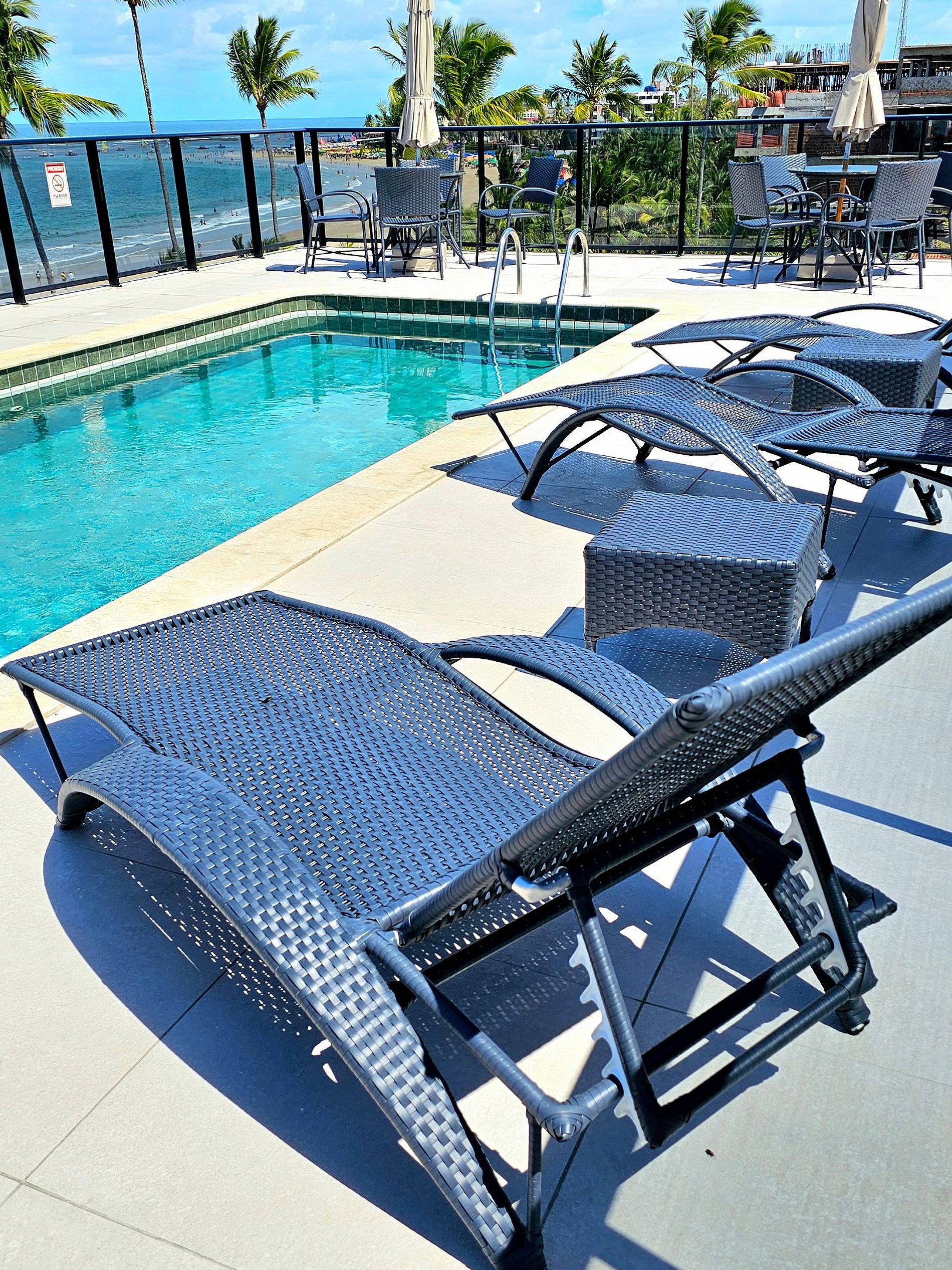 - Mesas de Apoio com cadeiras no Rooftop e também na praia.