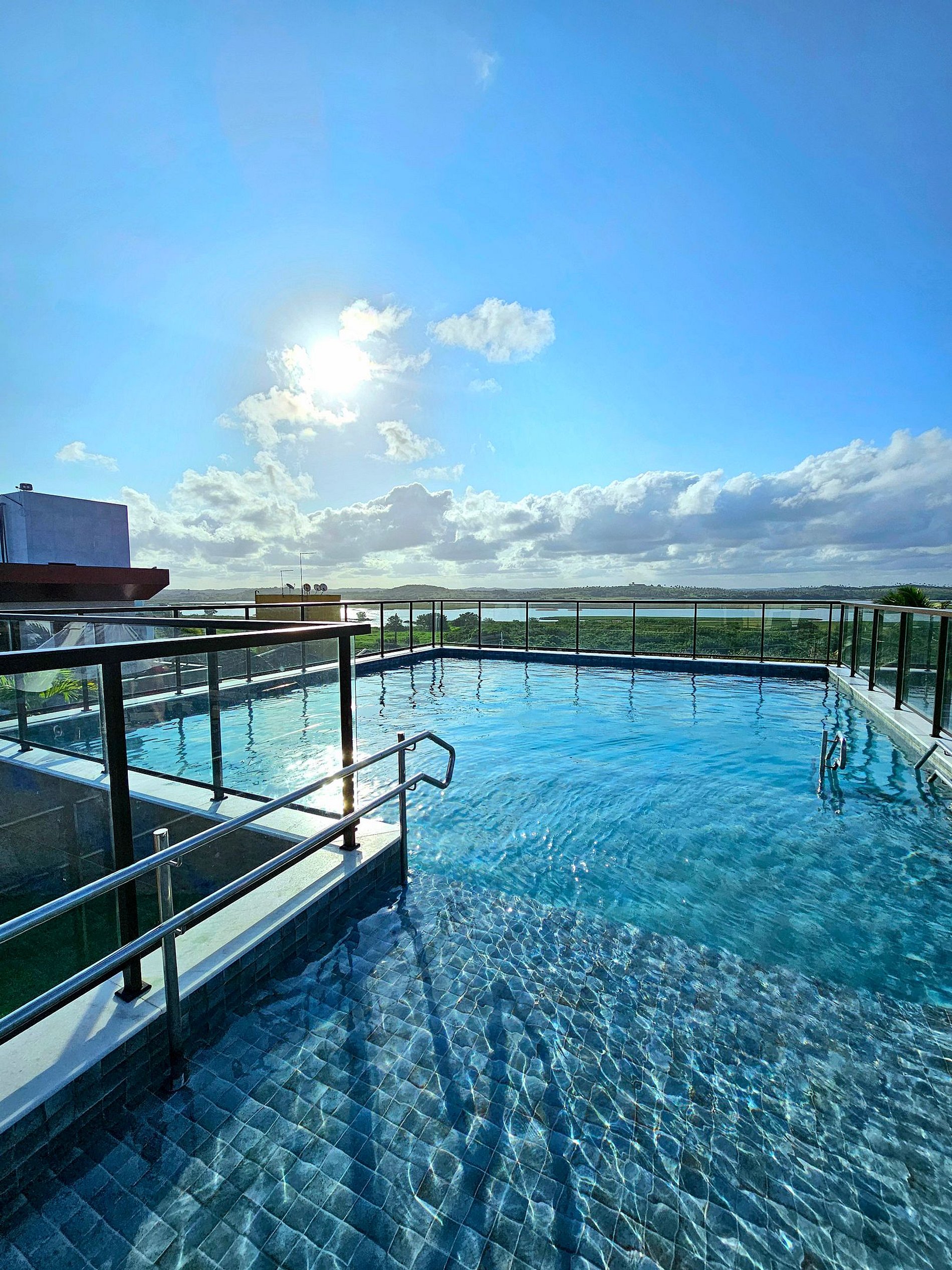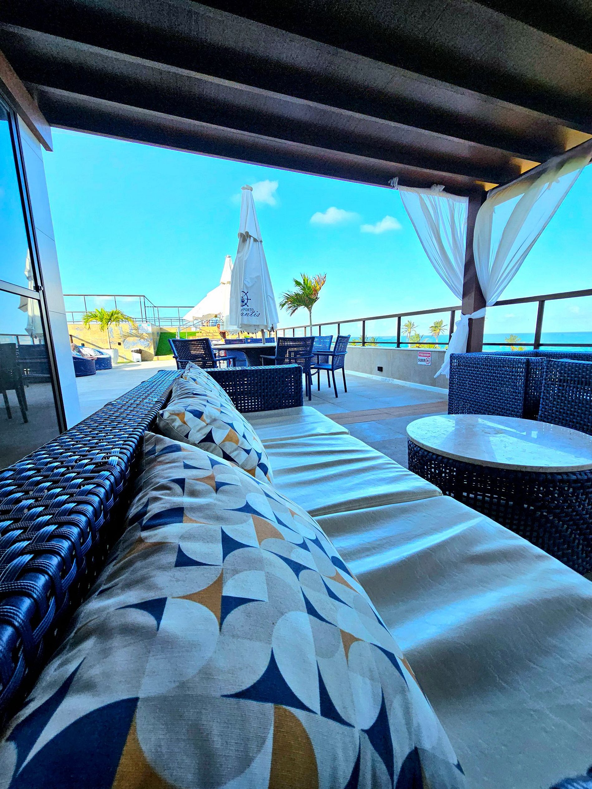 O Porto Atlantis foi projetado para oferecer uma estadia confortável e moderna, com uma estrutura completa e vistas incríveis. Um dos destaques é a piscina ampla com prainha, que oferece uma vista panorâmica espetacular do mar e do pôr do sol, proporcionando momentos únicos de relaxamento. Ao redor da piscina, você encontrará espreguiçadeiras e um lounge externo com mesas, perfeito para aproveitar o sol ou socializar com amigos e familiares.